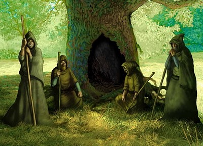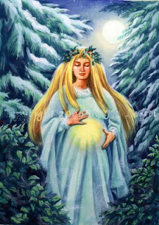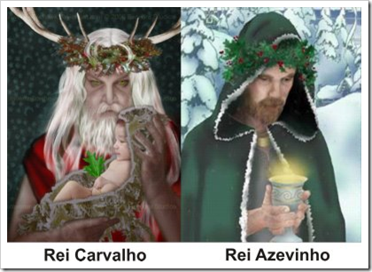 A noite era a mais longa e mais escura que já havia se visto. Movimentando-se com dificuldade devido aos avançados estágios de Sua gravidez, a Mãe de todas as coisas adentrou a floresta agora negra, buscando Aquele que comandava esta época do ano. Calmo, silencioso e taciturno, o Rei Azevinho esperava-A em meio às arvores nuas. Sua coroa de viçosas folhas verdes e os rubros frutos que a cobriam pareciam um tesouro em meio aos galhos secos espalhados por toda a parte, como se uma estranha magia os tivesse conferido o poder de sobreviver a estes difíceis tempos. Seus olhos eram firmes, Seus lábios cerrados pareciam esboçar um sorriso incompreensível, resistente, único. A Portadora da Vida sabia que seria difícil convencê-Lo a retirar-se. No entanto, ao sentir a Criança da Vida mover-se em Seu ventre, Ela tinha certeza: era chegado o momento.